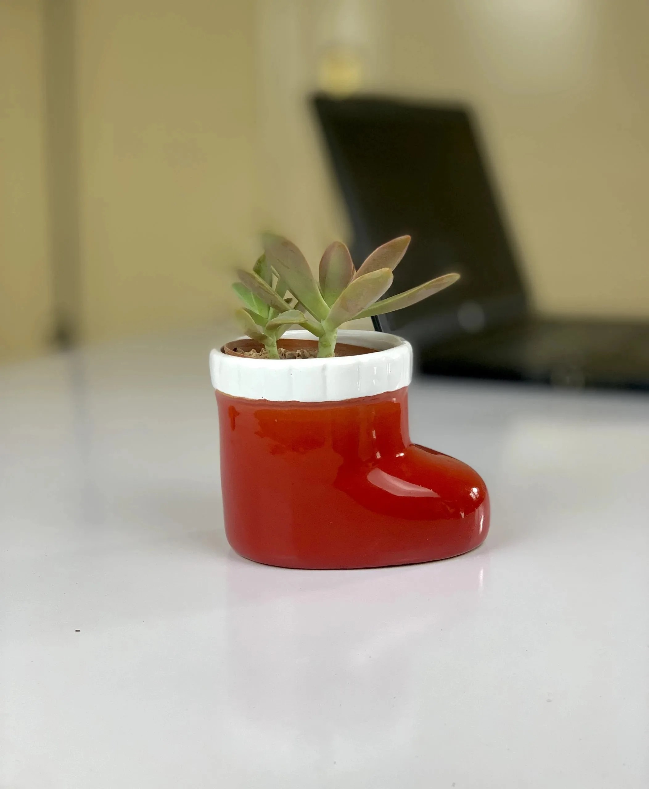 our ghost plant succulent, with its vibrant red and green foliage, is nestled snugly inside a whimsical santa boot pot. this playful combination is sure to add a touch of holiday magic to your home décor.