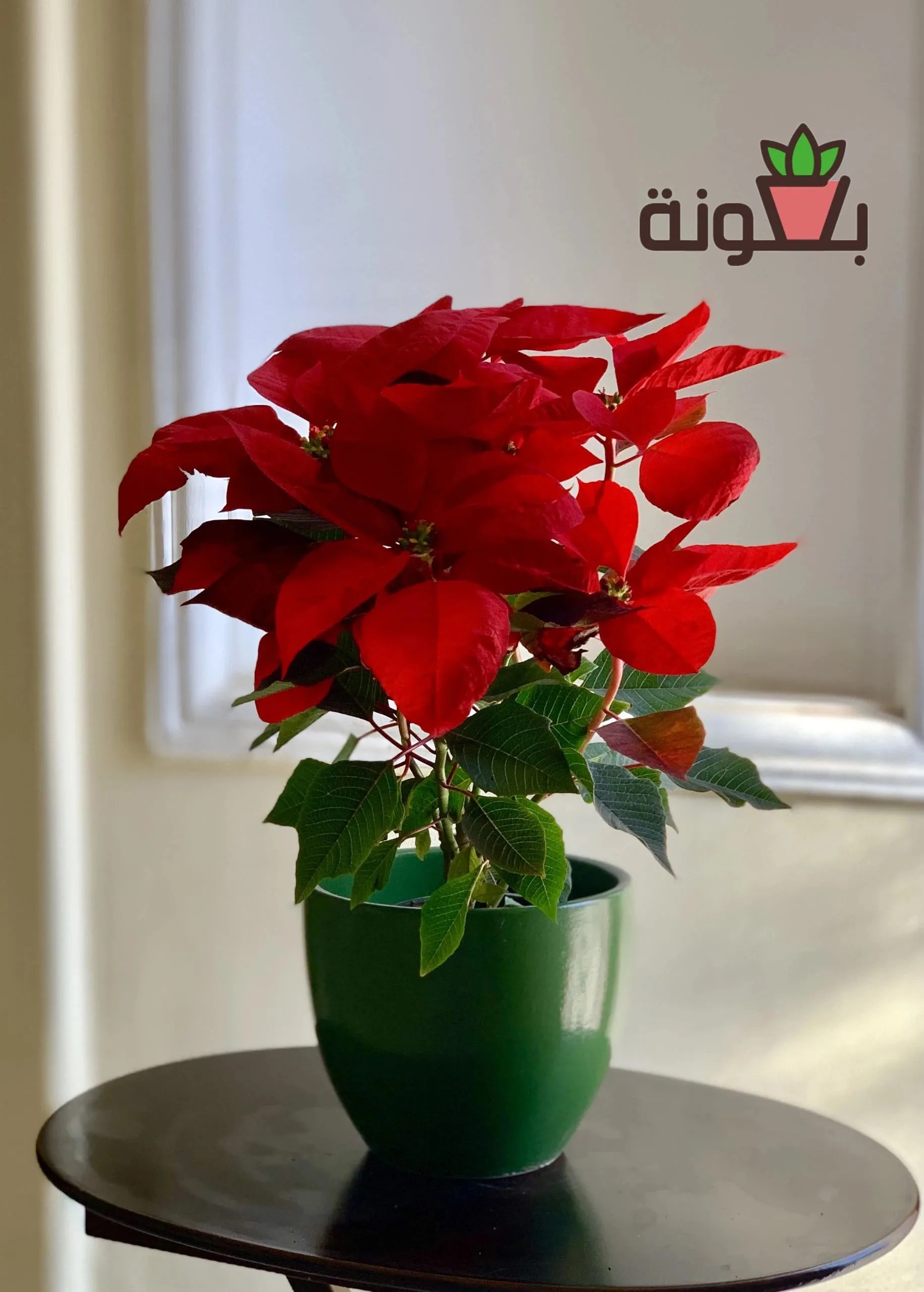 A stylish green glazed pot that adds contrast to the beautiful poinsettia, making it stand out even more.